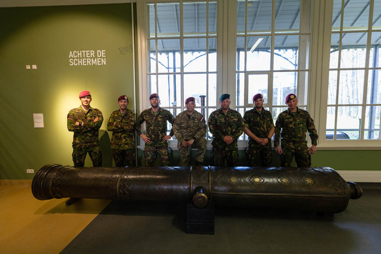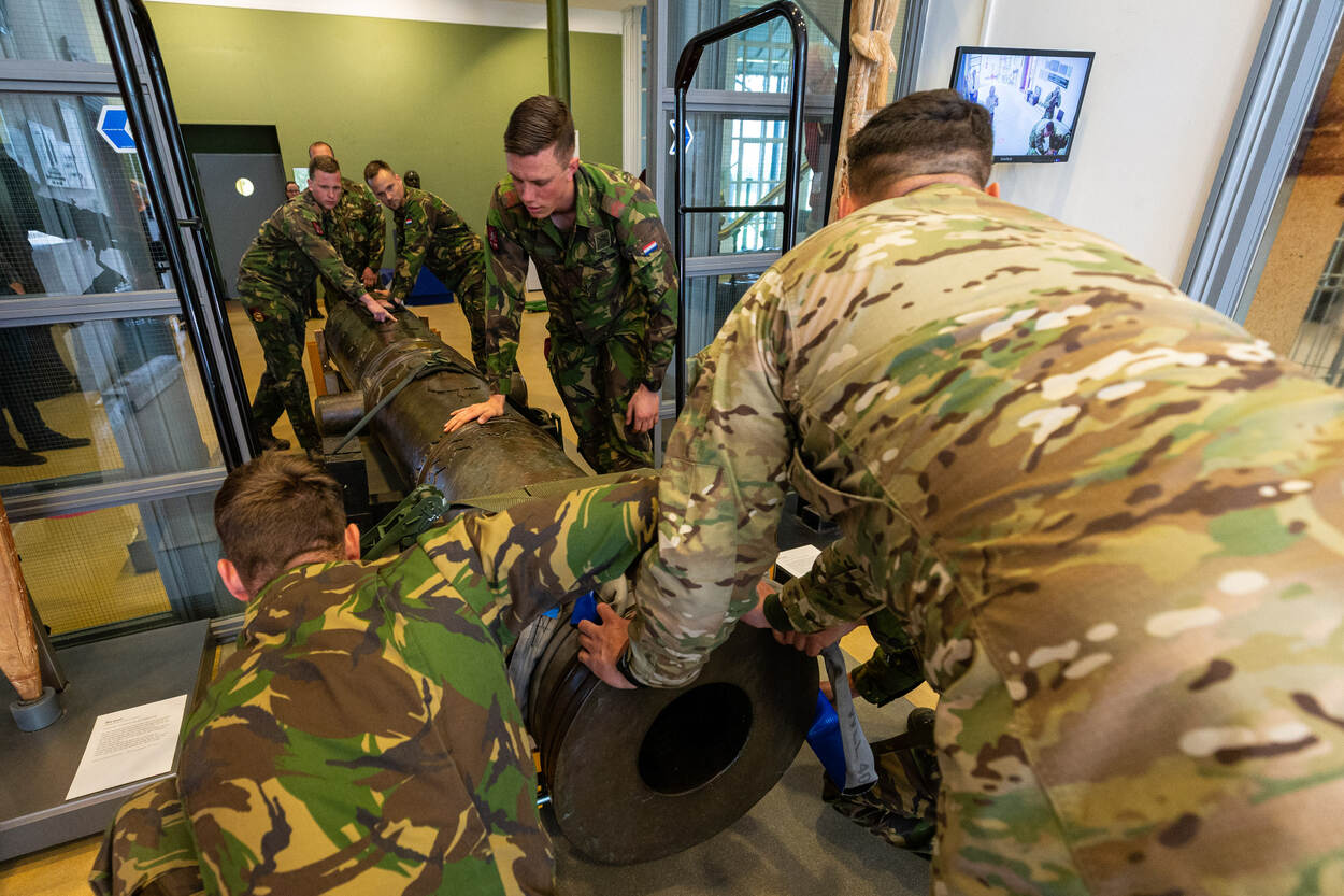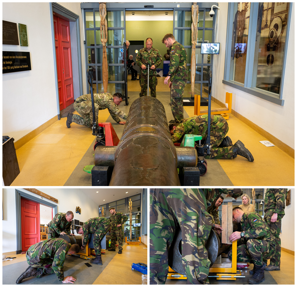 “Dit was een wel heel specifieke klus, waar we zelf een constructie voor moesten lassen, waar het kanon in kon hangen. Zoiets was niet te koop”, vertelt geniecommandant eerste luitenant Vincent Brinkman. Aanvankelijk zou het kanon - via de hal, buitenom en door een raam - naar z’n nieuwe onderkomen in de galerij worden verplaatst. “Alleen de aannemer kon de pui er niet op tijd uithalen. Daarom hebben we het object nu, plan b: via de detectiepoortjes en de tussendeur, tijdelijk in de hal gezet. Later volgt de verhuizing naar z’n uiteindelijke plek.”