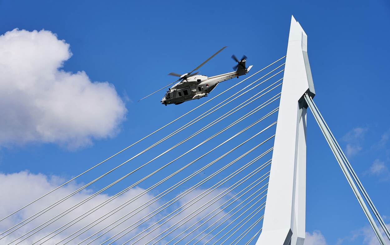 Een intrigerende foto uit Rotterdam. Uiteraard gaat het hier om de Erasmusbrug die ‘noord’ en ‘zuid’ met elkaar verbindt. Welk type helikopter we zien, hoeven we u als doorgewinterde Defensiekrantlezer niet te vertellen: de maritieme gevechtshelikopter NH-90. En de wolken? Ach, die passen bij iedere foto die in Nederland wordt gemaakt. Dat wisten zelfs Hollandse meesters als Jacob van Ruisdael in de zeventiende eeuw al.