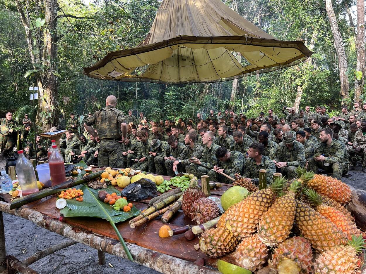 Militairen van 11 Luchtmobiele Brigade luisteren aandachtig naar de ‘chef-kok’. Althans, dat zou je denken wanneer je al het lekkers op de voorgrond ziet. Het gaat echter om een sfeerbeeld van de jungletraining die momenteel in Suriname wordt gegeven. In één van de komende Defensiekranten meer aandacht voor deze bijzondere training. Foto: 11 Luchtmobiele Brigade.