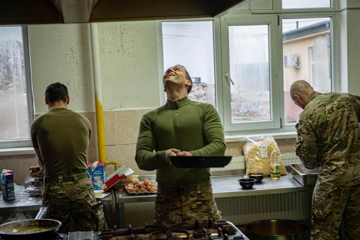 Het antwoord is ‘nee’! Het ei is nog onderweg, nadat deze militair van 11 Luchtmobiele Brigade het met een flinke zwieper naar boven heeft gegooid. Inmiddels weten we dat het keurig in de koekenpan is geland en daarna met smaak is opgegeten door de militairen in Roemenië die het kregen voorgeschoteld als paasontbijt. Foto: 11 Luchtmobiele Brigade.