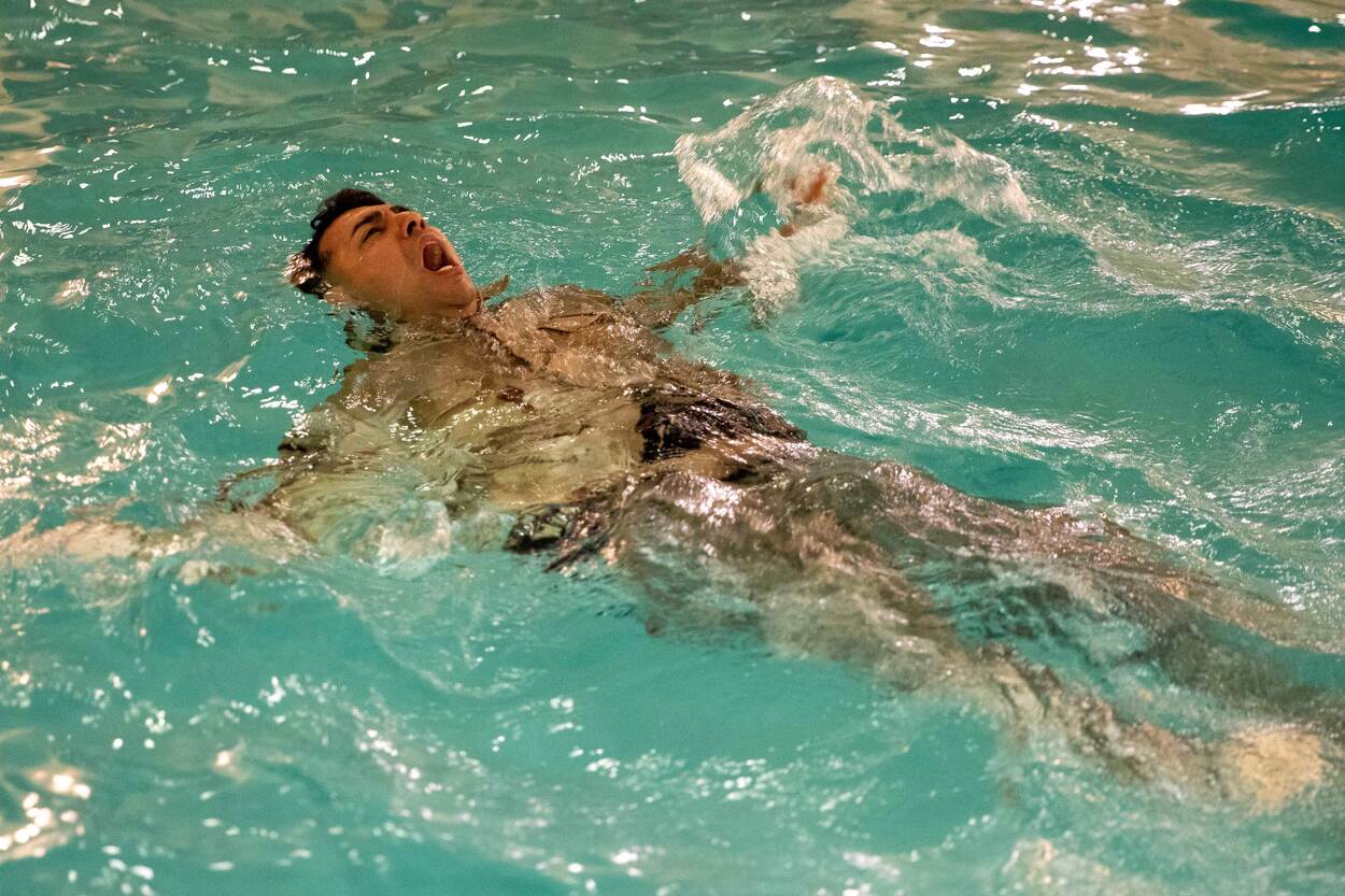 Alarm niet nodig, deze militair verkeert niet in nood. Althans, hij lijkt het onderdeel 'overleven in water' van de Best Warrior Competition 2023 wel spannend te vinden. Dit kampioenschap wordt georganiseerd door de Amerikaanse krijgsmacht.