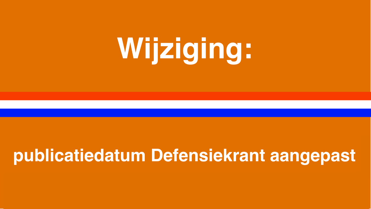 00 Dit artikel hoort bij: Defensiekrant 15 ~ Download afbeelding (282 kB) Vanwege Koningsdag, de Dodenherdenking en Bevrijdingsdag verschijnt de Defensiekrant niet op vrijdag 28 april en 5 mei. De eerstvolgende editie publiceren we eenmalig op woensdag 3 mei en vanaf 12 mei wordt het normale schema hervat.