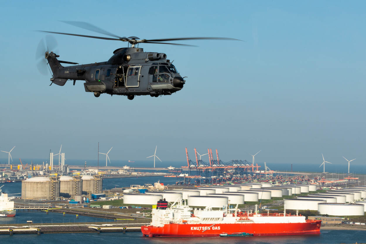 Een Cougar-transporthelikopter scheert over ongetwijfeld goed gevulde brandstoftanks in de Rotterdamse haven. Het gebied is kwetsbaar en dan wil je natuurlijk goed oefenen als er iets onverhoopt misgaat. De oefening Port Defender is bedoeld om de samenwerking tussen Defensie, het Havenbedrijf Rotterdam, de Veiligheidsregio Rotterdam-Rijnmond, de Kustwacht en Politie Landelijke eenheid te trainen. Gezamenlijk traden ze op tegen fictieve terroristische acties. De spelers beoefenden naast de onderlinge samenwerking eveneens hun eigen vaardigheden. MCD-fotograaf-met-vliegbrevet sergeant-majoor Cristian Schrik legde het tafereel vast.