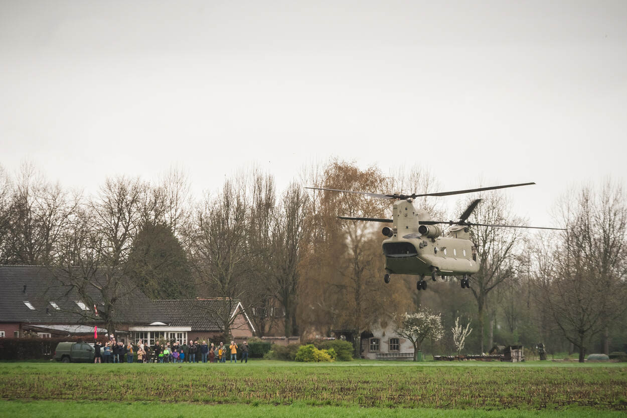In de rubriek Globaal vermeldden we vorige week de zogenoemde buitenlanding van een CH-47 ‘Chinook’ transporthelikopter bij het Gelderse Brummen. Daarvan waren toen nog geen foto’s, maar fotograaf Arthur Pfaff schiet LENS! graag te hulp. Hij nam met zijn camera waar dat de nagelnieuwe Nederlandse Chinook even ten noorden van Veghel laag over de bebouwing scheerde.Op de grond stonden zo’n veertig volwassenen en kinderen de helikopter op te wachten. Zij mochten ook even in het toestel kijken. Na ongeveer driekwartier is de Chinook, met als afscheid nog een rondje rondom de bezoekers, weer vertrokken”, laat Arthur ons weten.