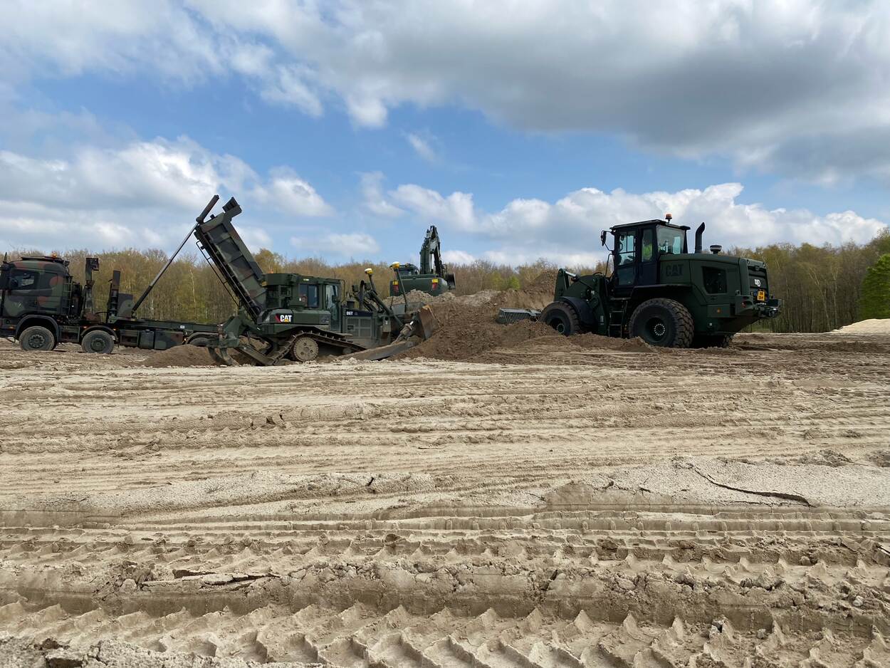 Sergeant Sander spotte deze opmerkelijke scène op het oefen- en trainingsveld van het Opleidings- en Trainingscentrum Genie in Vught. Het komt niet vaak voor dat zoveel machines van het OTC Genie in een beeld zijn te vangen. Rechts de nieuwe bouwmachine Cat 930M. In het midden op de bult staat de Hydraulische Graafmachine (HGM) op rupsbanden. Dan linksvoor de ‘rupsdozer’ Cat D6 en daar achter de Scania kipper. Een feestelijke foto in het jaar dat het Wapen der Genie 275 jaar bestaat. Sodeju!