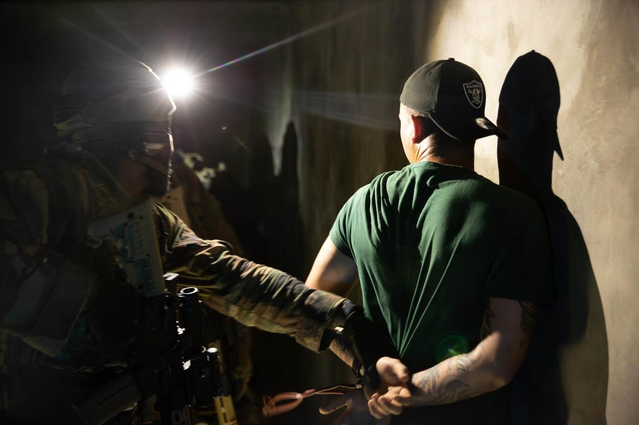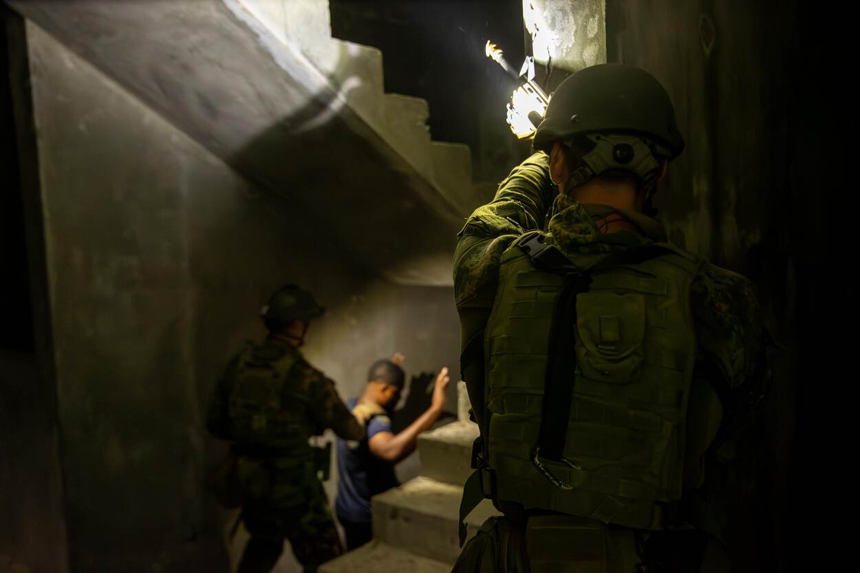 Sommige oefenvijanden komen toch met de armen omhoog naar buiten. Al geeft het grootste deel van de mensen in het gebouw zich niet zonder slag of stoot gewonnen. Een scenario dat zomaar eens realiteit zou kunnen worden. De oefenontruiming maakt onderdeel uit van de Hurricane Relief Exercise (HUREX).