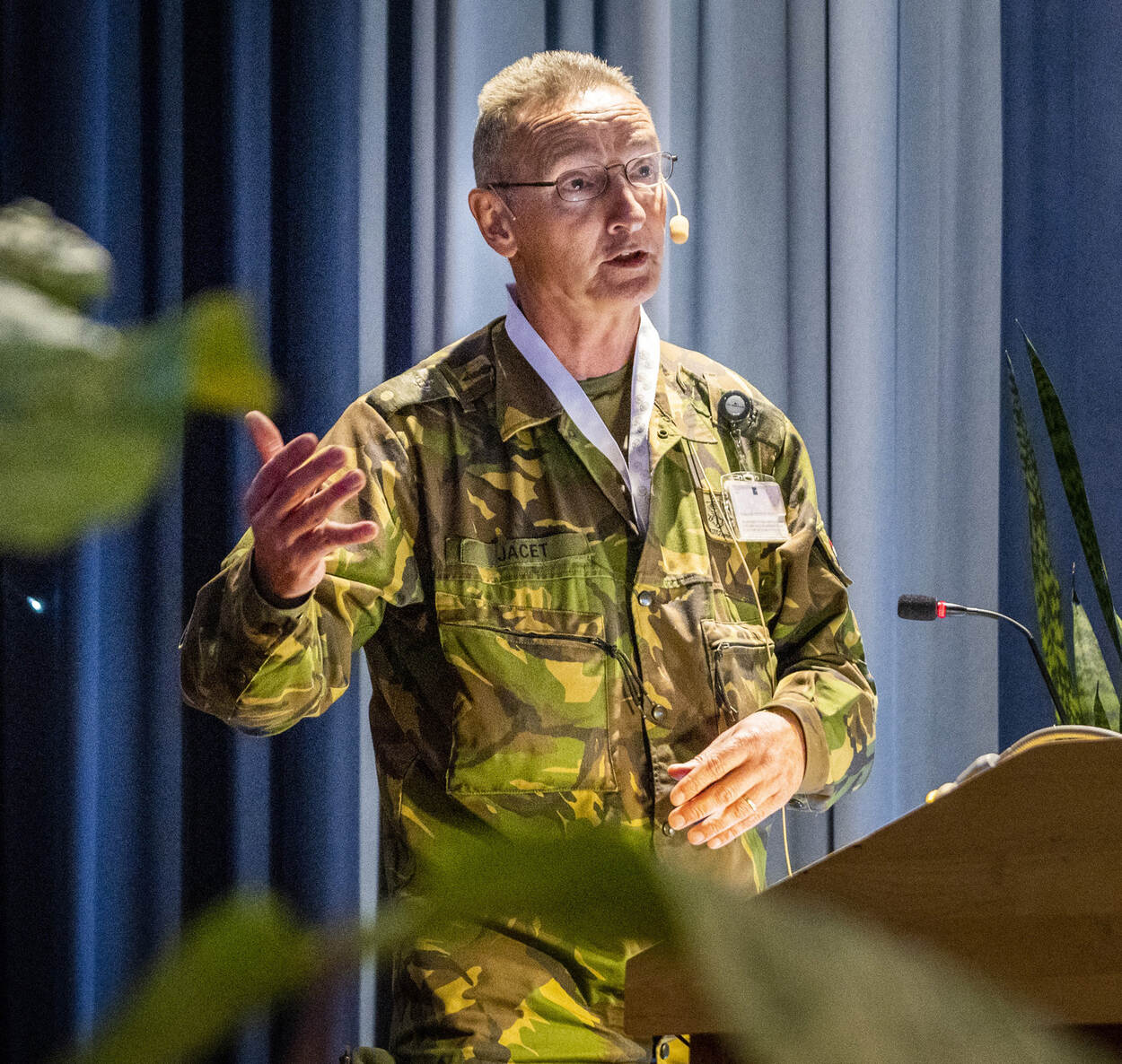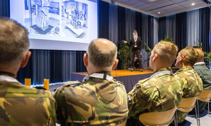 ‘Kraanofiel’ adjudant Arno legt de zaal uit welke materialen de Genie ter beschikking heeft.