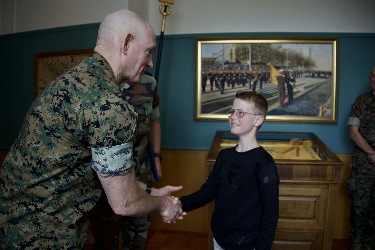 Een stevige hand voor Thijn, de zoon van majoor Mark Brouwer van het Korps Mariniers. Niet zomaar een hand: hij behoort toe aan Troy Black, dé sergeant-majoor van het U.S. Marine Corps. Majoor der mariniers Brouwer ontving de Navy and Marine Corps Commendation Medal voor zijn werk als liaison-officier gedurende twee jaar bij 2d Reconnaissance Battalion, 2d Marine Division. Er bestaat een speciale band tussen 2d Recon Bn en ons Korps Mariniers, tot uitdrukking komend in een permanent gestationeerde uitwisselingsofficier en bilaterale oefeningen op Camp Lejeune en Aruba. Overigens vermeldt het fotobijschrift in het Amerikaanse archief doodleuk dat de foto is gemaakt in Rotterdam, Duitsland...