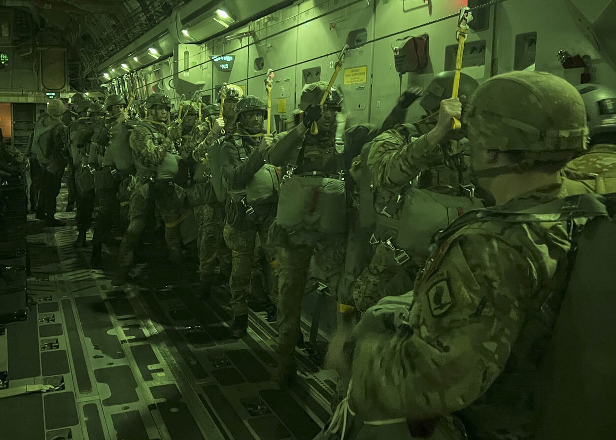 Personeel van 11 Luchtmobiele Brigade en 503 Parachute Infantry Regiment lijnen op voor een static line sprong uit een C-17 Globemaster III van 62d Airlift Wing boven Griekenland. De foto is genomen tijdens de oefening Swift Response, gerelateerd aan Air Defender ‘23. De oefening focust op snelle strategische ontplooiing van troepen van de U.S. Army Europe en U.S. Air Forces Africa, samen met troepen van bondgenoten en partners. (foto: U.S Air Force, Senior Airman Callie Norton)