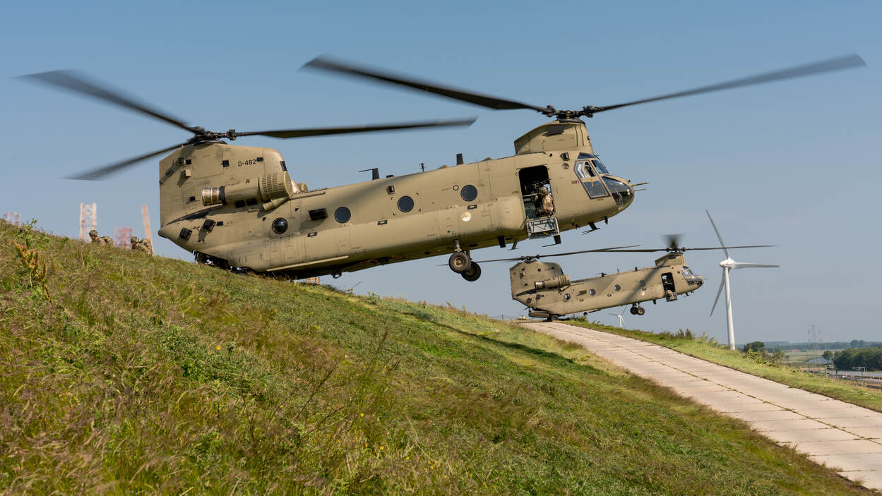 Fraaie foto van twee Chinooks CH47F van 298 squadron die tijdens de oefening Bevoseals zestig mannen en vrouwen van 11Bevocie in de haven van Vlissingen aan de grond zetten voor een opdracht. Bij een zogenaamde 'ridgeline' landing staan alleen de achterste wielen van de Chinook op de grond en houdt de piloot, in nauwe samenwerking met de loadmasters de rest van de kist in de hoverstand. Dit soort landingen wordt in de regel alleen in de Alpen uitgevoerd, maar deze trainingslocatie bood een prima alternatief en ook een mooie uitdaging! (foto: smi S.P. Hoek, 11 bevoorradingscompagnie AASLT)