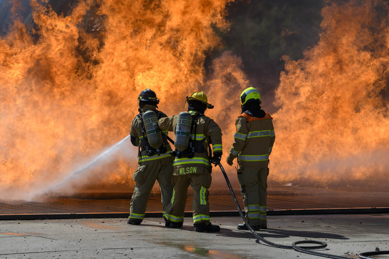 US Air Force senior airman Walker Taylor en Roscoe Wilson, brandbestrijders behorend tot 424 Air Base Squadron, gaan de strijd aan met een best brandje... Dat doen ze onder toezicht van een Nederlandse brandmeester op het Brandweer Opleiding en Training Centrum van de Koninklijke Luchtmacht op vliegbasis Woensdrecht. (foto: U.S. Army, Pierre-Etienne Courtejoie)