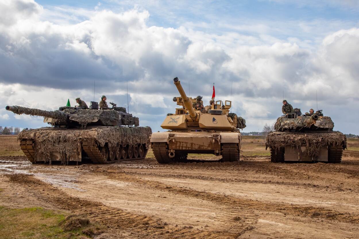 Ze worden wel de beste tanks ter wereld genoemd. Reden waarom Oekraïne zo blij is met de levering van deze stalen monsters. Op deze foto is goed het verschil te zien tussen de M1A2 Abrams tank (midden) en de Duitse Leopard 2A6 tank. De tanks werden op de foto gezet tijdens een gecombineerde live fire oefening in Polen. (foto: U.S. Army, Staff Sgt. Matthew A. Foster)