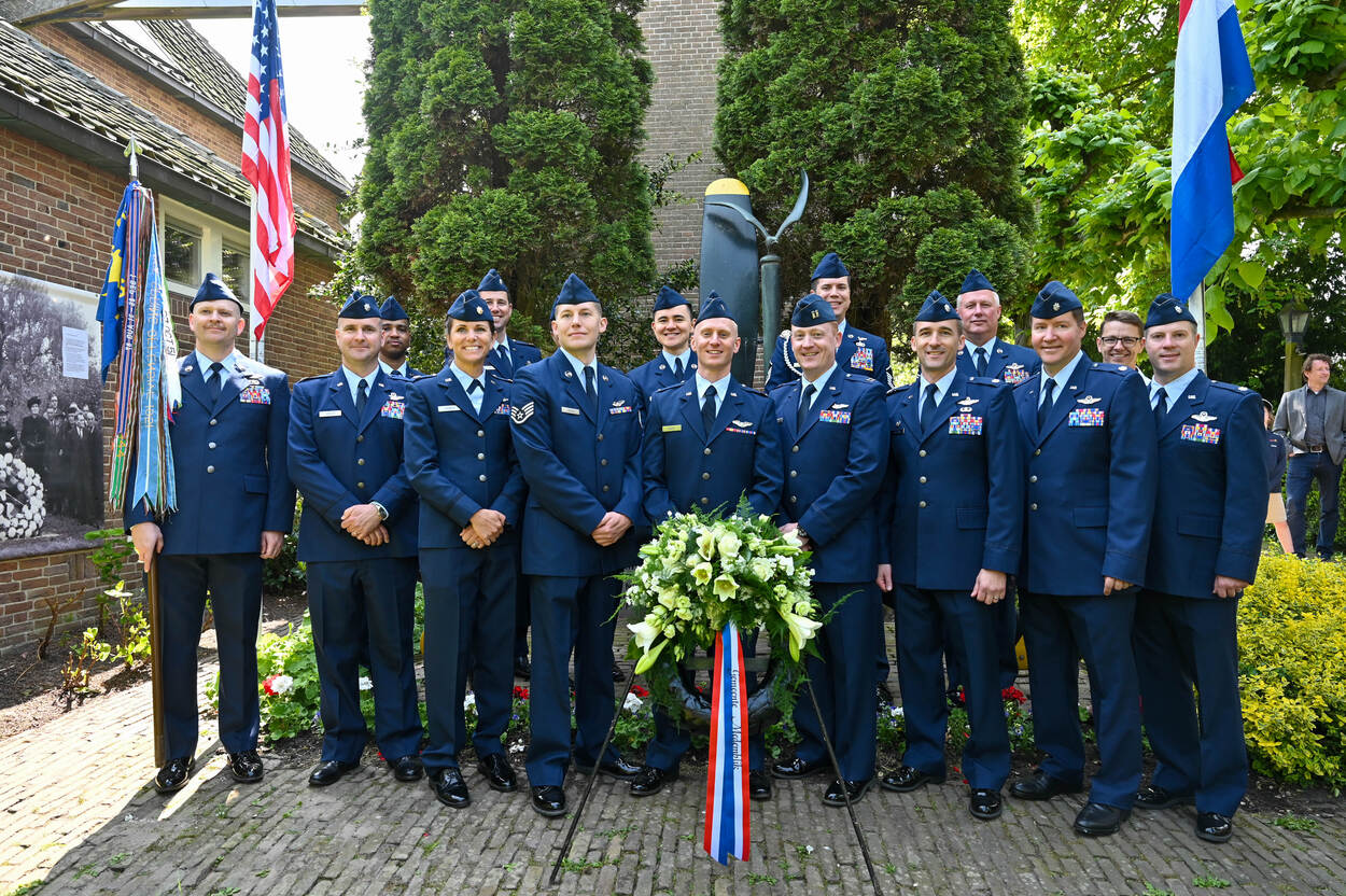Reservisten van 728 Airlift Squadron poseren bij het oorlogsmonument voor B-17 bommenwerper 'Lucky Lady' in Midwoud. Het toestel crashte op 20 januari 1945 boven Nederland, waarbij zeven van de acht bemanningsleden omkwamen. Een delegatie Amerikanen van het huidige 728 Airlift Squadron, dat de voortzetting is van het 728 Bomber Squadron waartoe de Lucky Lady behoorde, heeft tijdens een korte ceremonie in Midwoud het staartwiel van het toestel in ontvangst genomen. Uitgever en filmmaker Peter Sasburg uit Midwoud legt momenteel de laatste hand aan een (aanvullende) documentaire over de Lucky Lady die volgend jaar moet uitkomen. (foto: U.S. Air Force, senior airman Ann Butler)