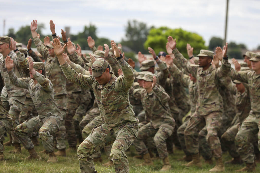 Soldaten uit Italië, Frankrijk en Nederland vieren met een speciaal dansje dat ze geslaagd zijn voor de Air Assault school, gevestigd op de luchtmachtbasis Mihail Kogalniceanu in Roemenië. Op deze school leren de militairen wat er allemaal komt kijken hoe ze veilig sling loads onder helikopters moeten bevestigen. (foto: US Army, Pfc. Kaylan Joseph)