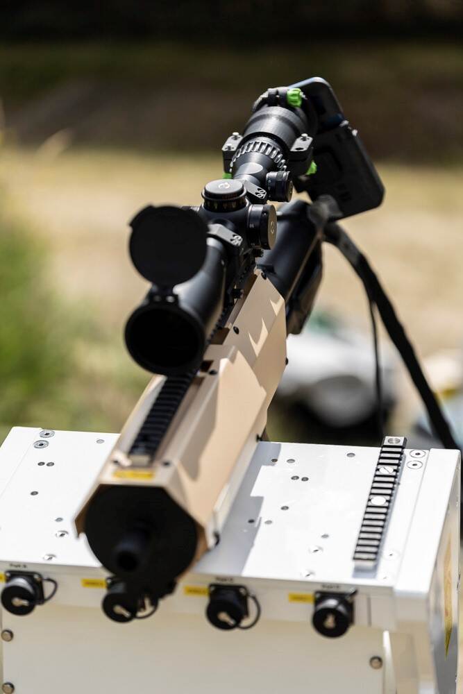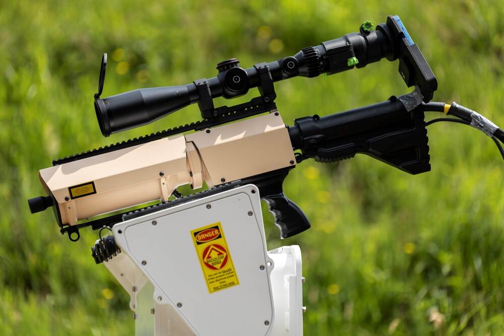 Voorzien van een picatinny rail en een telescoopvizier heeft een high energy laser wel wat weg van een geweer.