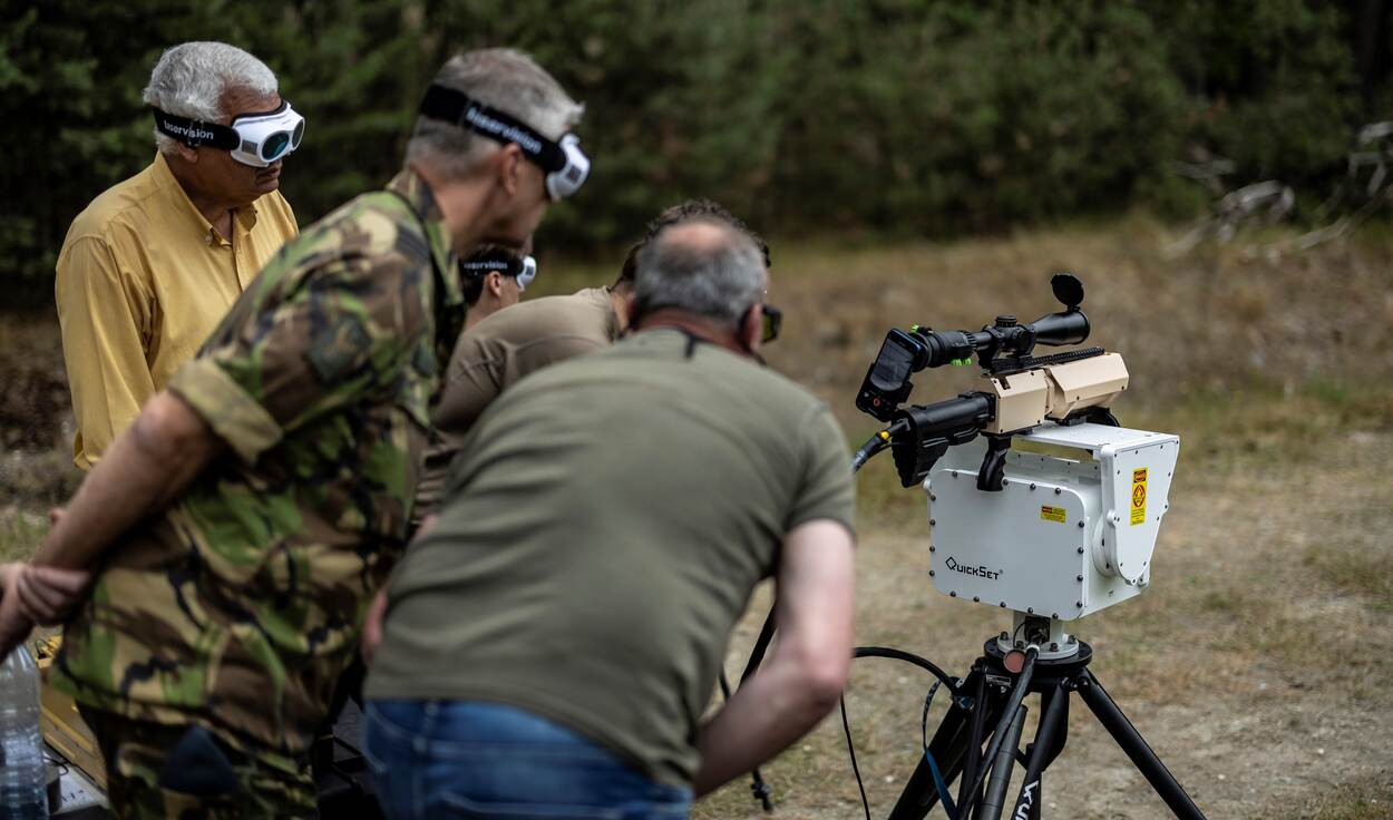 De oriëntatiedag maakt deel uit van een innovatietraject binnen DEC-IED en werd bijgewoond door afgevaardigden van de Explosieven Opruimingsdienst Defensie, Genie, het Nederlands Lucht- en Ruimtevaartlaboratorium en politie. Met speciale brillen tegen straling bekeek het gezelschap hoe onder meer een beveiligingscamera, een mobieltje, stukken plaatmetaal en verschillende mortiergranaten zonder lading over een afstand van zo’n 125 meter werden bestraald. “We zijn uiteraard geïnteresseerd in de uitwerking van de laser”, begint Trum. “Daarbij willen we hier aanwezige specialisten kans geven te bekijken of zij lasertechniek in hun werkveld kunnen toepassen. Tijdens deze verkenning gaan we niet te diep op de materie in. We willen simpelweg te weten komen of we iets met deze apparatuur kunnen en wie interesse heeft.”