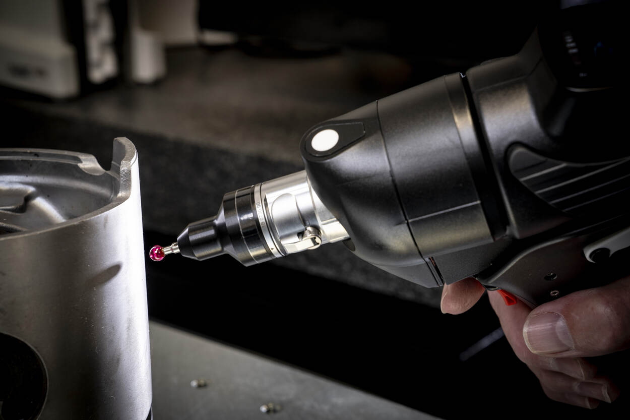 Met een 3D-meetarm worden een zuiger en een drijfstang driedimensionaal in beeld gebracht (foto links). Ook hier doet de robijn het fijne meetwerk.