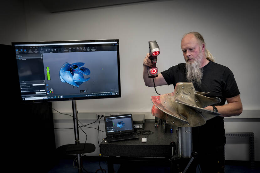 Voor objecten die zich vanwege hun vorm of omvang moeilijk laten opmeten, wordt de laser scanner ingezet. “Daarmee kunnen we ‘vrije vormen’ meten, zoals een schroefblad” benadrukt de chef van de vakgroep Rob van Gelder. “Daar plakken we referentiepunten op en door een laser daarop te richten krijgen we zeer nauwkeurige, driedimensionale beelden van het object.