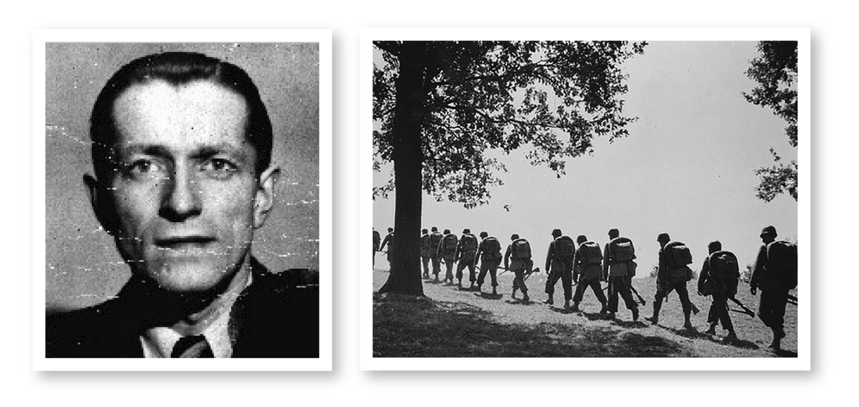 Links de Poolse student Feliks Bruks (foto United States Holocaust Memorial Museum). Rechts Poolse soldaten in single file (achter elkaar in lange rij) onderweg naar het front (foto Beeldbank WO2 – NIOD).