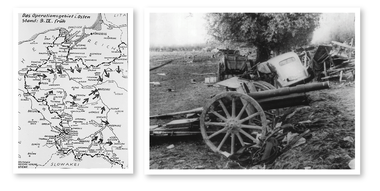 Op een kaart is goed te zien hoe Polen vanuit drie windrichtingen wordt binnengevallen (foto Beeldbank WO2 – NIOD). Duitsers passen de Blitzkrieg toe, een nieuwe tactiek om de vijand snel te overrompelen en uit te schakelen. Het Poolse leger beschikte over verouderd materieel (foto: Wikimedia Commons).
