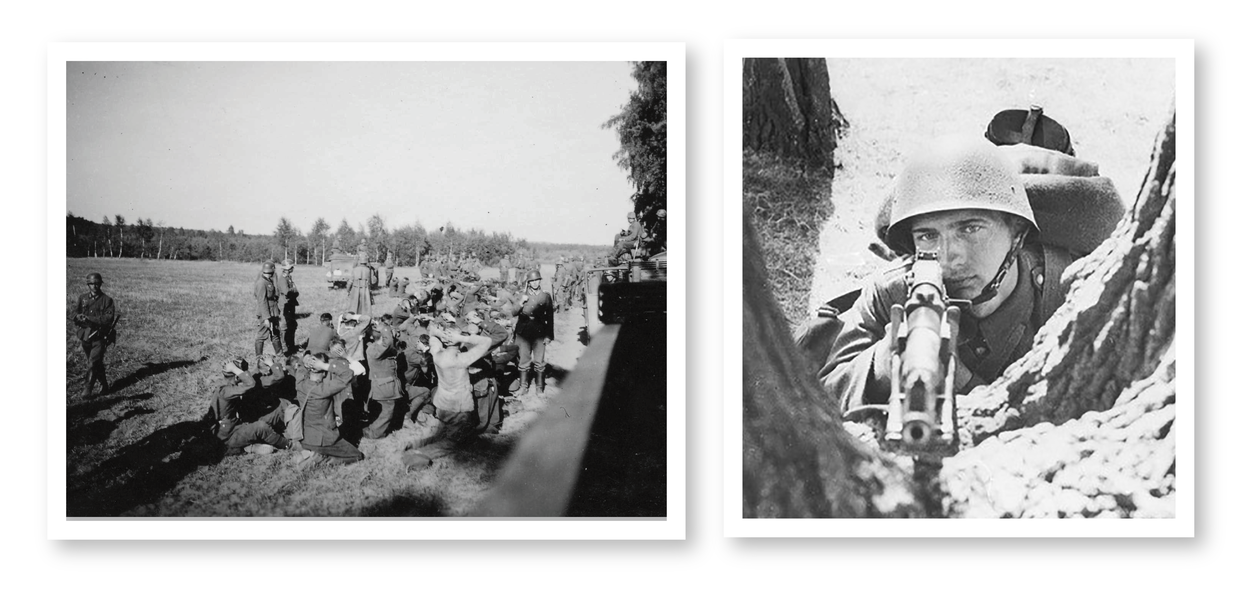 Poolse eenheden trekken zich al snel terug of worden krijgsgevang gemaakt (foto: Wikimedia Commons). Poolse troepen bieden op sommige plekken fel weerstand, maar delven het onderspit (foto: Beeldbank WO2 – NIOD).