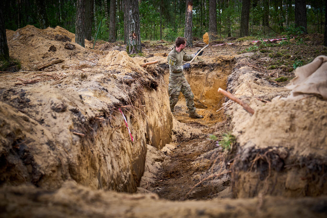 Militairen van de NAVO-missie enhanced Forward Presence (eFP) in Litouwen zijn bezig met de aanleg van een loopgravenstelsel in Rukla. De infanterie gaat er binnenkort voor het eerst mee oefenen.