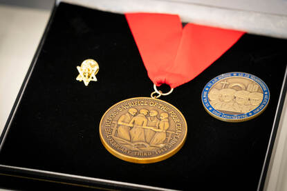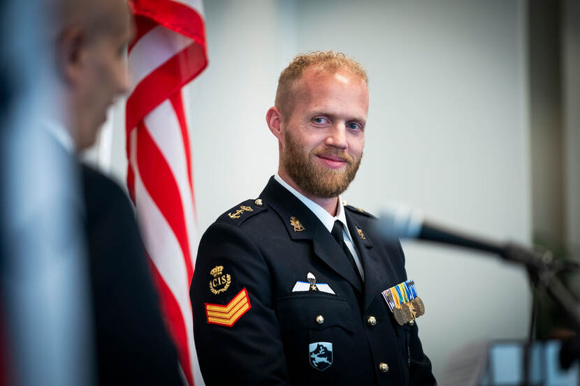 Dennis van der Kraats ontvangt de Legion of Honor Bronze Medallion uit handen van US marine veteran Howard Schaeffer, bestuursvoorzitter bij de Amerikaanse Four Chaplains Memorial Foundation.