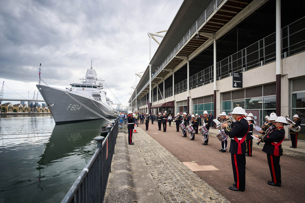 Je komt er niet speciaal voor naar ’s werelds grootste defensie- en veiligheidsbeurs in Londen, maar het is wel een plaatje. Een van de bekendste militaire orkesten op deze aardkloot, The Bands of His Majesty's Royal Marines, verzorgde tijdens DSEI een optreden vlakbij de valreep van Zr.Ms. De Ruyter. Onze fotograaf Phil Nijhuis aarzelde geen moment, snelde naar buiten en kiekte het geheel met de hippe wijk Canary Wharf op de achtergrond. Elders in deze Defensiekrant een reportage over de beurs.