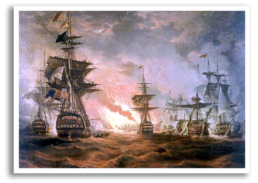 Het Franse leger voer met meer dan veertigduizend manschappen en honderden schepen door de Middellandse Zee, achtervolgd door een meer bescheiden Brits vlooteskader onder bevel van Horatio Nelson. Dat leidde, na vele omzwervingen door beide partijen, op 1 augustus 1798 tot de Slag bij de Nijl. Ook wel de Eerste Slag bij Aboukir genoemd. De Britse vloot onder leiding van Nelson behaalt hier, na onder meer de vernietiging van het Franse vlaggenschip Oriënt, een belangrijke overwinning. De Franse vloot werd bijna compleet vernietigd. Dit was Napoleons eerste grote militaire tegenslag. Zijn plannen voor een opmars naar Brits-Indië waren verkeken. De Franse vloot zou in geen tientallen jaren een serieuze partij meer zijn voor de Britse, zoals bij Trafalgar zeven jaar later nog eens zou blijken.