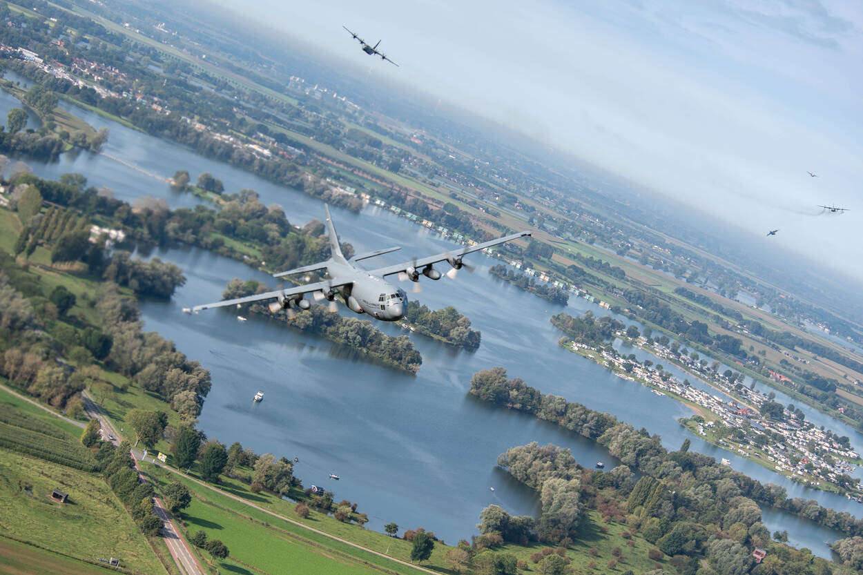 Tijdens de herdenking van de Operatie Market Garden gonsde het in de lucht van deelnemende vliegtuigen uit verschillende landen. Toestellen uit onder meer de Verenigde Staten, Italië, Roemenië, Griekenland, Polen en natuurlijk Nederland namen deel aan een gezamenlijke herdenkingsvlucht, waarbij ook nog eens parachutisten werden gedropt. Deze prachtige plaat wilden we u niet onthouden! (foto: Jordan Lazaro, US Air Force)
