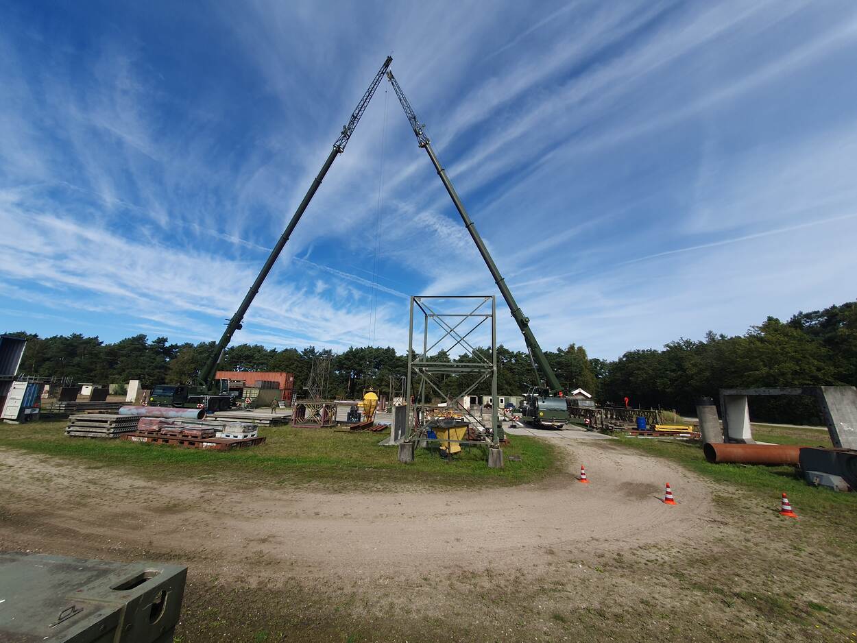 Onze genie heeft de beschikking over acht mobiele hijskranen van het type Liebherr LTM 1055. Slechts twee daarvan, in gebruik bij het Opleidingscentrum, zijn uitgerust met een zogenaamde klap jib. Pardon, een wat? “De klap jib is het extra deel aan de bovenkant, waarmee we de kraan een hoogte tot 48 meter kunnen geven. Dat levert dus extra bereik op”, doceert sergeant instructeur kranen Laurens Vermeulen. Hij maakte deze foto, waarop het door het gekozen standpunt net lijkt of de bovenkant van de kranen een dakje vormen.