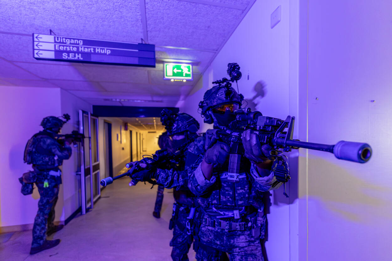 Het oude TerGooi ziekenhuis in Blaricum werd deze week omgetoverd tot militaire oefenlocatie. Geen patiënten met klachten of geneeskundig personeel in witte jassen, maar volledig omgehangen mariniers van 12 Raiding Squadron in de verlaten gangen, poliklinieken en slaap- en spreekkamers. De training is een voorbereiding op eventuele inzet van de Marine Spearhead Task Unit die binnen 48 uur overal ter wereld ingezet kan worden en waarvoor deze militairen stand-by staan. Zoals recent in Soedan.
