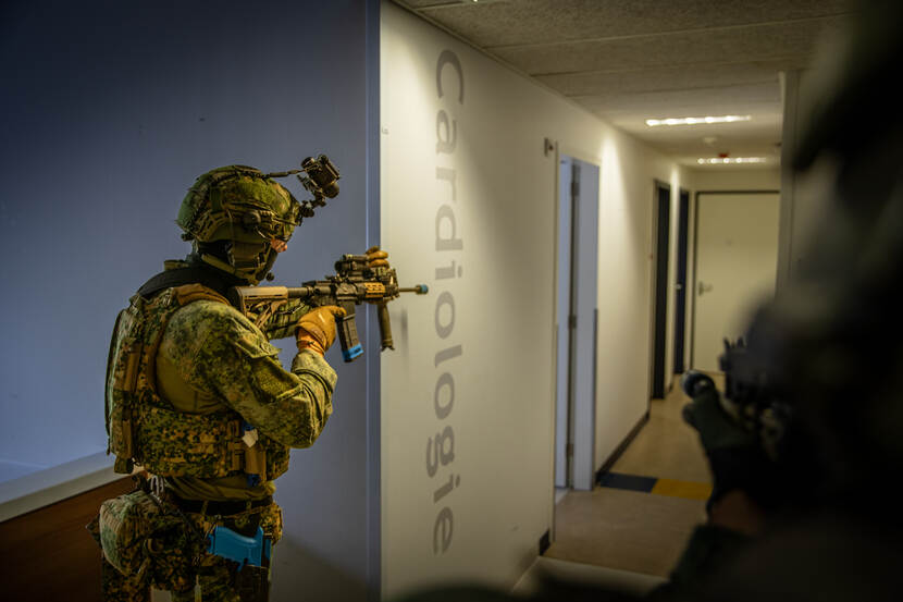 “En wij maken hier graag gebruik van”, benadrukt troopcommander eerste luitenant der mariniers Gijs. “Steeds vaker vindt ons optreden plaats in verstedelijkt gebied, ofwel Military Operations in Urban Terrain (MOUT). Een civiel ziekenhuis dat tot voor kort nog in gebruik was, simuleert dat heel goed.”