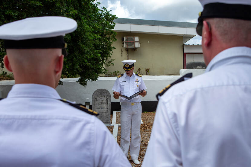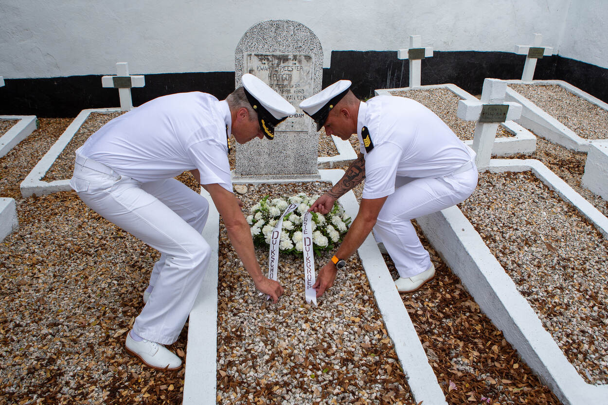 Het waren de 29-jarige kwartiermeester en duiker Herman Burger, en de pas achttienjarige matroos, kok en hulpduiker Gerrit ten Donkelaar die op 18 oktober 1963 tijdens hun werk het leven lieten. “Iedere derde donderdag in november herdenkt de DDG in Den Helder hen en nog drie andere marineduikers die sinds 1963 omkwamen tijdens hun werk”, vertelt kapitein-luitenant-ter-zee Sander Kool, commandant van de eenheid. “Nu we op het eiland zijn vanwege de oefening DIVEX CARIB 2023, het precies zestig jaar geleden is dat Herman en Gerrit sneuvelden en zij bovendien als enigen van de vijf hier op Curaçao liggen begraven, noemen we hier nu graag hun namen.”