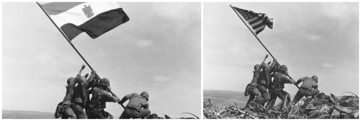 Twee van onze lezers wezen ons erop dat de gebruikte foto een vervalste uitsnede blijkt te zijn van de foto van Joe Rosenthal, genomen op 23 februari 1945. Op het originele beeld zijn vijf Amerikaanse mariniers en een marine-hospik te zien. Na de landing op het Japanse eiland Iwo Jima planten zij op de top van de Suribachi een Amerikaanse vlag. Een pro-Egypte photoshopper verving die vlag op een onbekend moment voor een Egyptisch exemplaar. Toegegeven, dat is professioneel gedaan. Het beeld is amper van echt te onderscheiden. Maar het is wel degelijk fout en dat willen we dan ook graag rechtzetten.