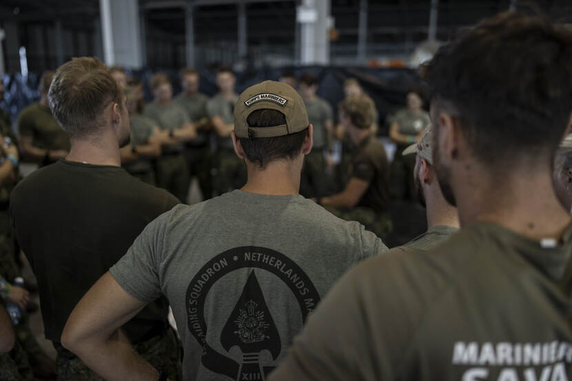 “Aan de kant!” Een jonge marinier springt weg en maakt ruim baan voor een korporaal der mariniers die een palletbox vol uitrusting op de juiste plaats zet. Zo eigent iedereen zich letterlijk zijn eigen plekje toe in de hangar, waar ook Cypriotische heli’s staan geparkeerd.