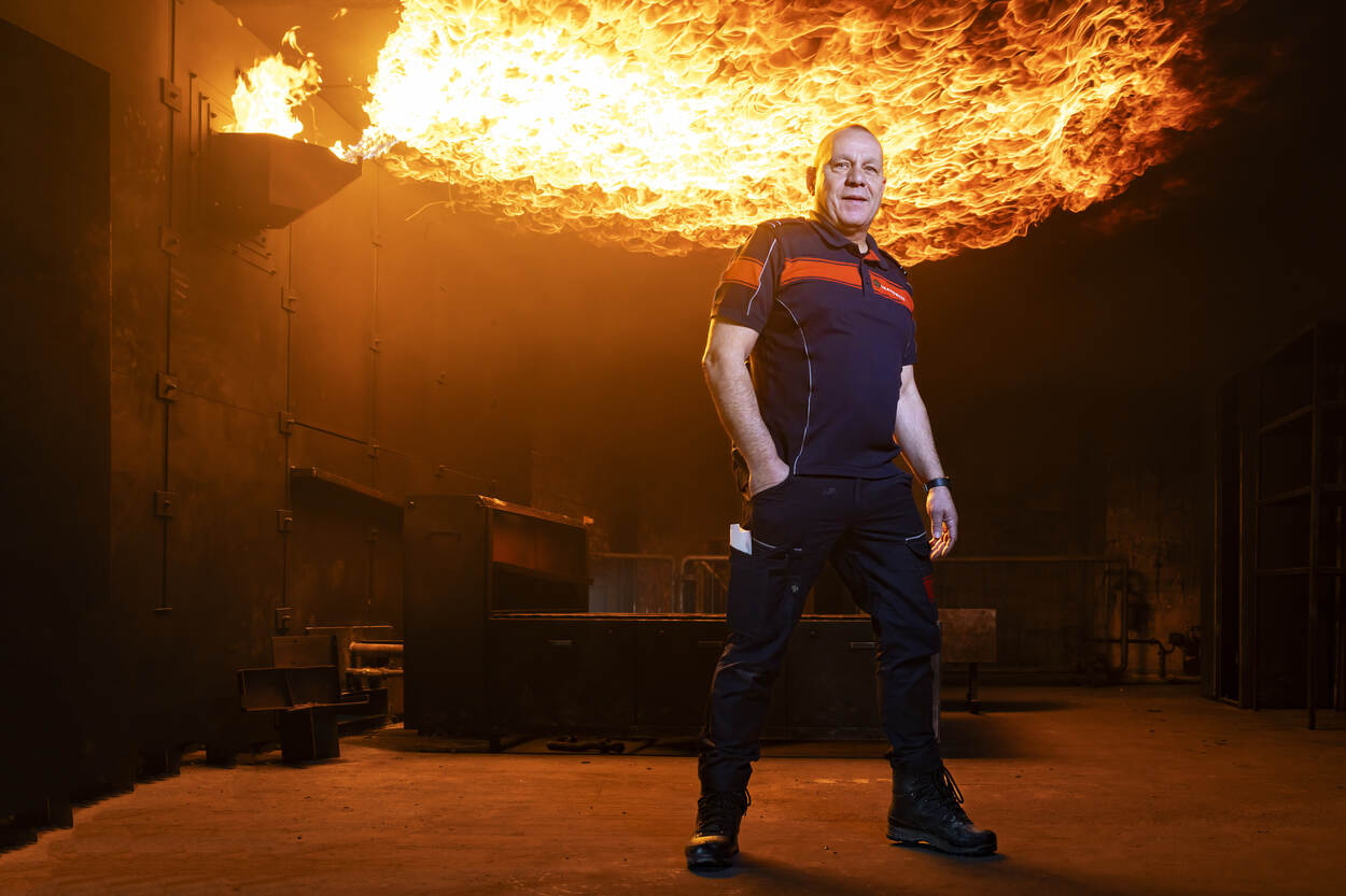 Een man staat in een stoere houding in een donkere ruimte met op de achtergrond een enorme steekvlam die met een computer aan- en uitgezet kan worden.