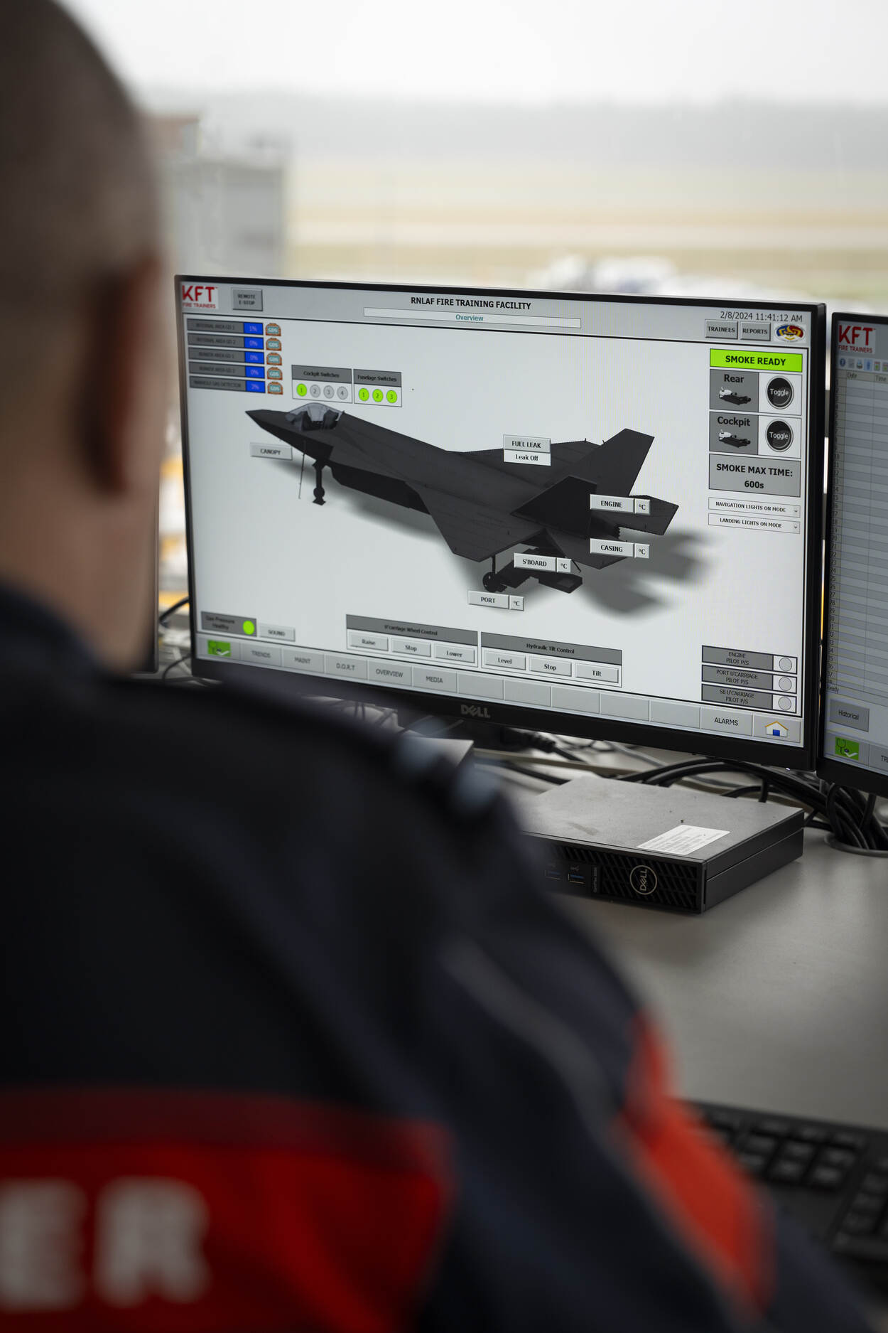 Willem van Laar in de bedieningstoren van het BOTC van waaruit de mock-ups bediend worden en de branden gecoördineerd. Linksvoor het nieuwe model van de F-35.