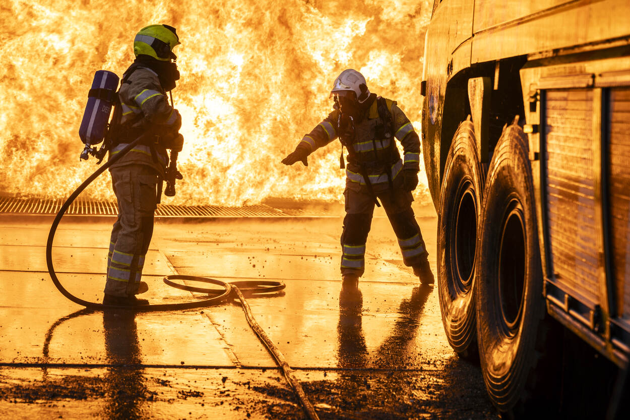 Twee brandweermannen zijn bezig met het uitrollen van de brandslang bij de crashtender, met op de achtergrond een grote vlammenzee.