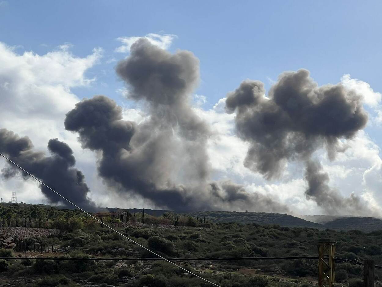 Een groen landschap met lichte heuvels in Zuid-Libanon met in de lucht inktzwarte rookwolken van een raketaanval.