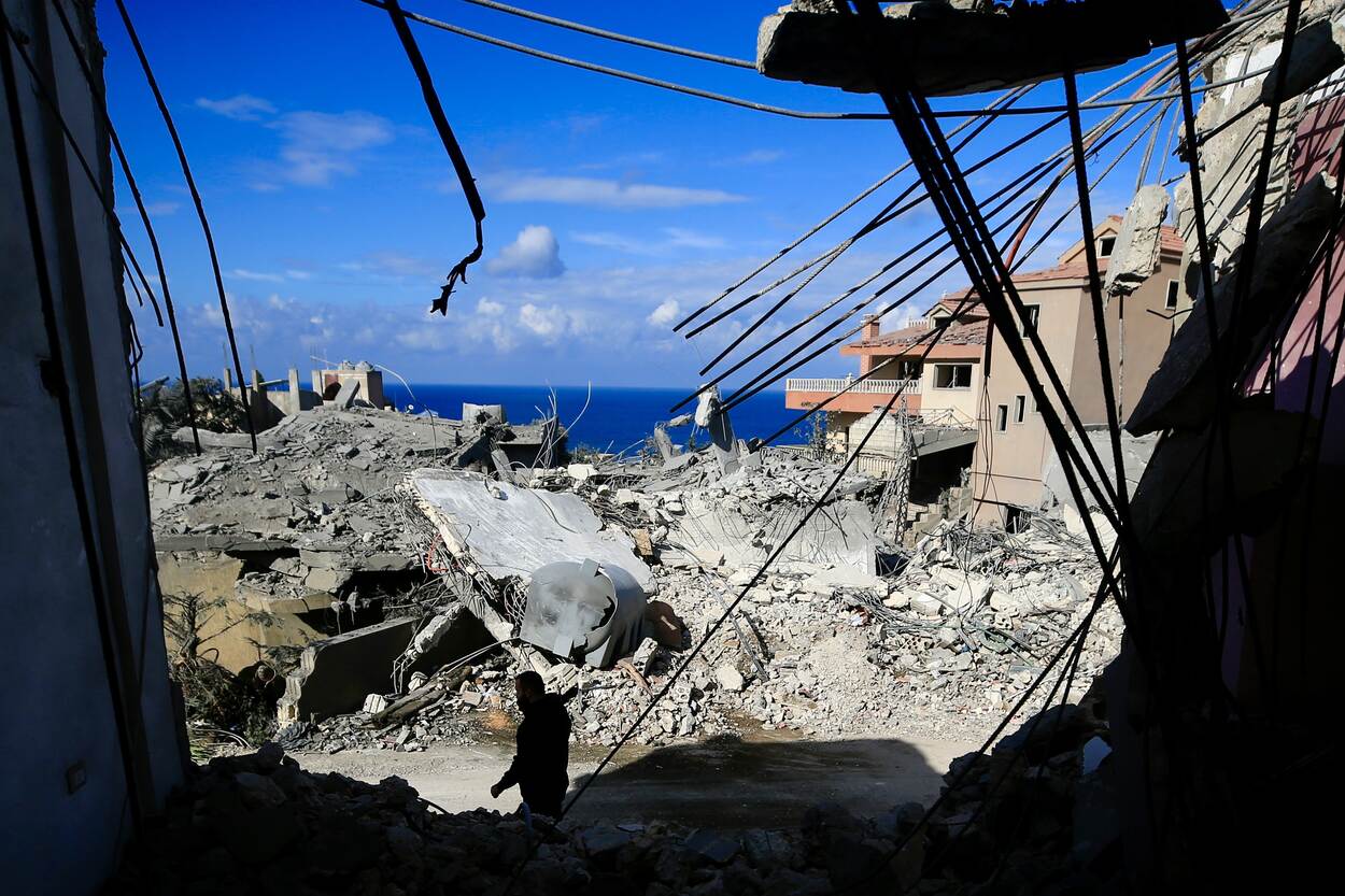 Een man loopt door de stad Naqoura, of wat daarvan over is na een Israëlische luchtaanval.