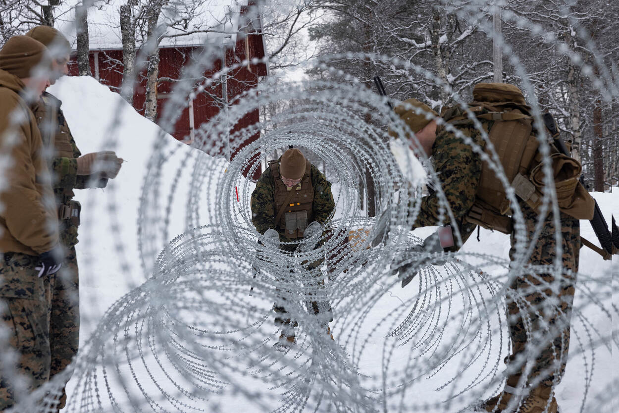 Bij die andere oefening rond Scandinavië, Nordic Respone, zijn onder andere US Marines aanwezig. Ter plekke bereiden ze hun deelname aan de oefening tot in de puntjes voor. Pottenkijkers zijn daarbij niet altijd welkom en dus komen de rollen concertinadraad tevoorschijn om de tijdelijke verblijfplaatsen af te schermen van ongewenste bezoekers. Korporaal Orlanys Diaz Figueroa had de handen vrij om deze fraaie plaat te schieten.