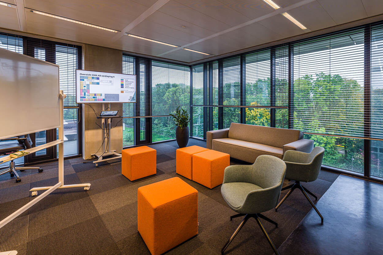 Een zithoek op de Kromhoutkazerne, met een bank, twee stoelen, vier poefjes en een whiteboard.