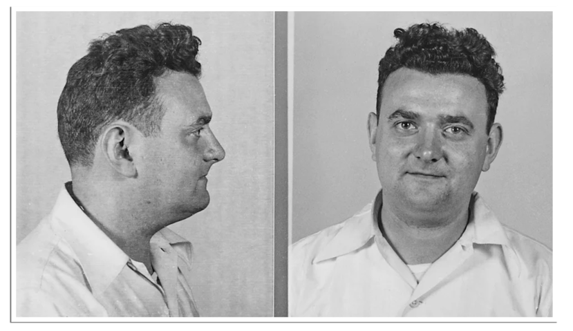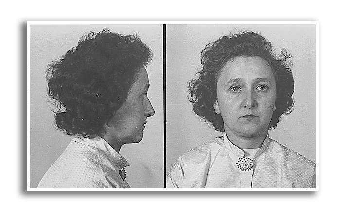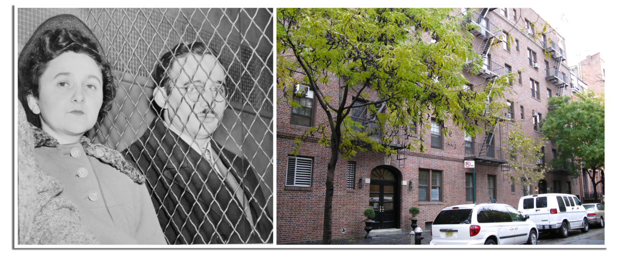 Foto links: Gescheiden door een hekwerk in de arrestantenbus rijden Julius en Ethel Rosenberg weg van het U.S. Court House na de uitspraak van de jury. Foto rechts: Het appartementencomplex in Morton Street (New York) waar het Rosenberg-echtpaar in 1950 werd gearresteerd.