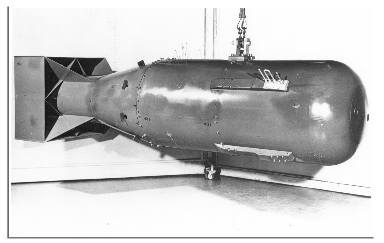 Atoombom Little Boy die werd afgeworpen boven Hiroshima, Japan, in augustus 1945. Dit was de eerste foto van Little Boy die werd vrijgegeven door de Verenigde Staten.