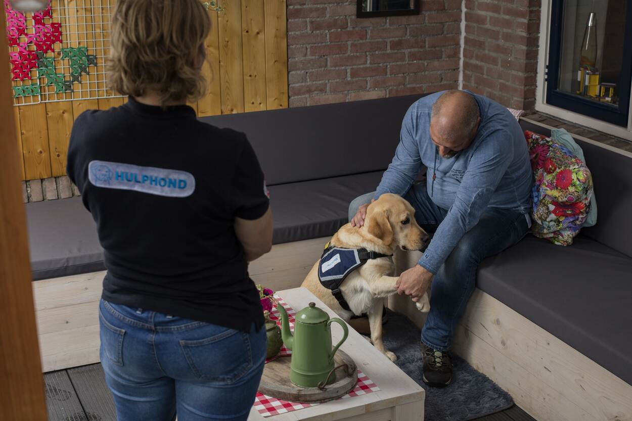 Een man knuffelt op de bank zijn hulphond terwijl een vrouw toekijkt.