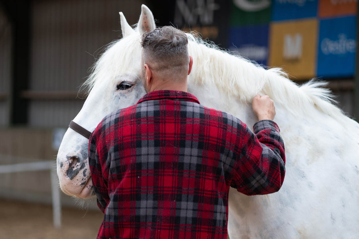 Een man met een geblokt overhemd staat met z’n rug naar de camera en aait het hoofd van een paard.