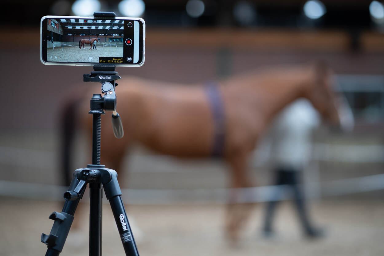 Met een iPhone op een ‘selfiestick’ wordt de interactie tussen een deelnemer en een paard in een paardenbak gefilmd.