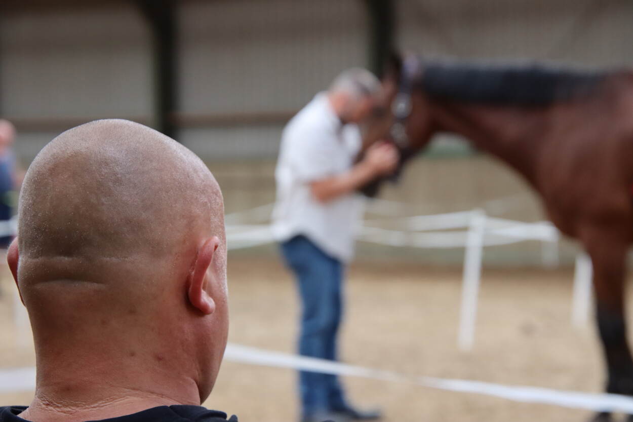 In de verte staat een man voor het paard, met z’n hoofd tegen het voorhoofd van het paard. En scherp op de voorgrond zien we een kalende man toekijken.