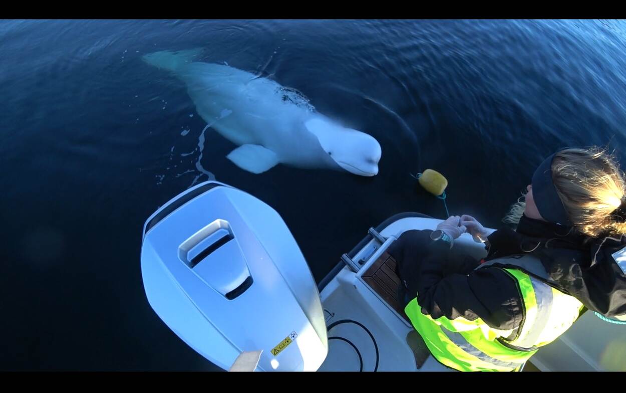 Het is april 2019 als een wit schepsel in zee de aandacht van een Noorse vissers trekt. Walvissen komen hier in het noordelijkste puntje van de wereld wel vaker voor, maar zo nadrukkelijk vlakbij de mensen? Dat is vreemd. De witte beloega lijkt verstrikt te zitten in een net. Om het dier te bevrijden hijst een van de vissers zich in een rood, waterdicht pak en springt het water in. Het dier schrikt niet. Het menselijke gezelschap lijkt hem juist te animeren.